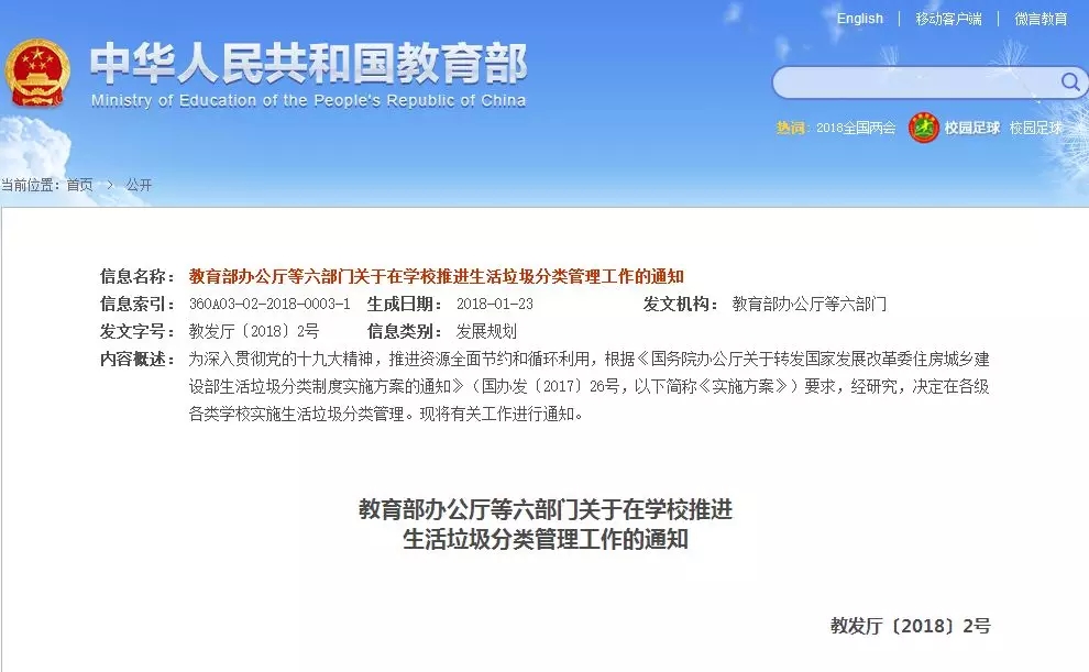 為深入貫徹黨的十九大精神,推進資源全面節(jié)約和循環(huán)利用,根據(jù)《國務院辦公廳關(guān)于轉(zhuǎn)發(fā)國家發(fā)展改革委住房城鄉(xiāng)建設(shè)部生活垃圾分類制度實施方案的通知》(國辦發(fā)〔2017〕26號,以下簡稱《實施方案》)要求,經(jīng)研究,決定在各級各類學校實施生