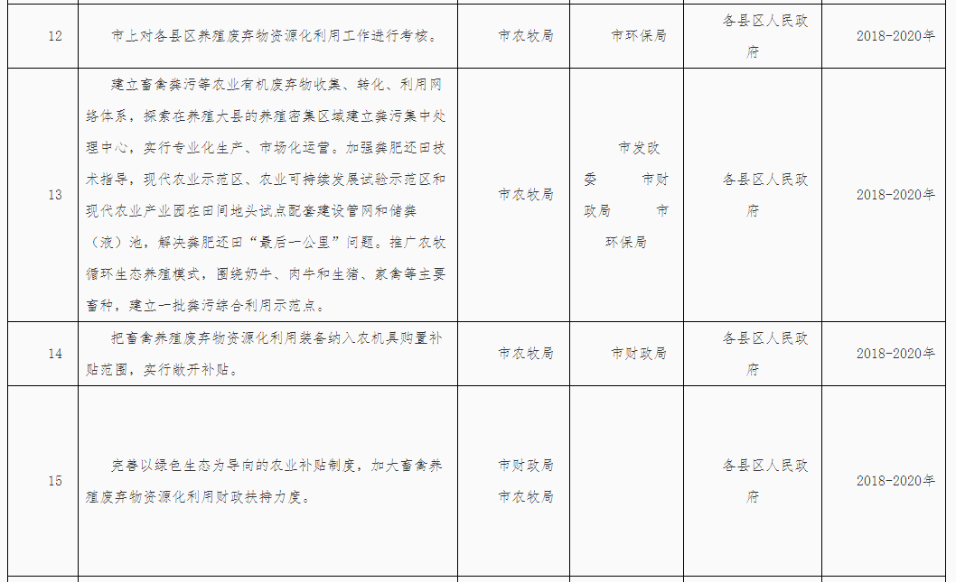 4.政府引導(dǎo),市場運作。健全完善以綠色生態(tài)為導(dǎo)向的農(nóng)業(yè)補貼制度,建立企業(yè)投入為主、政府支持、社會資本積極參與的市場化運營機制,引導(dǎo)和鼓勵社會資本投入,培育發(fā)展畜禽養(yǎng)殖廢棄物資源化利用產(chǎn)業(yè)。