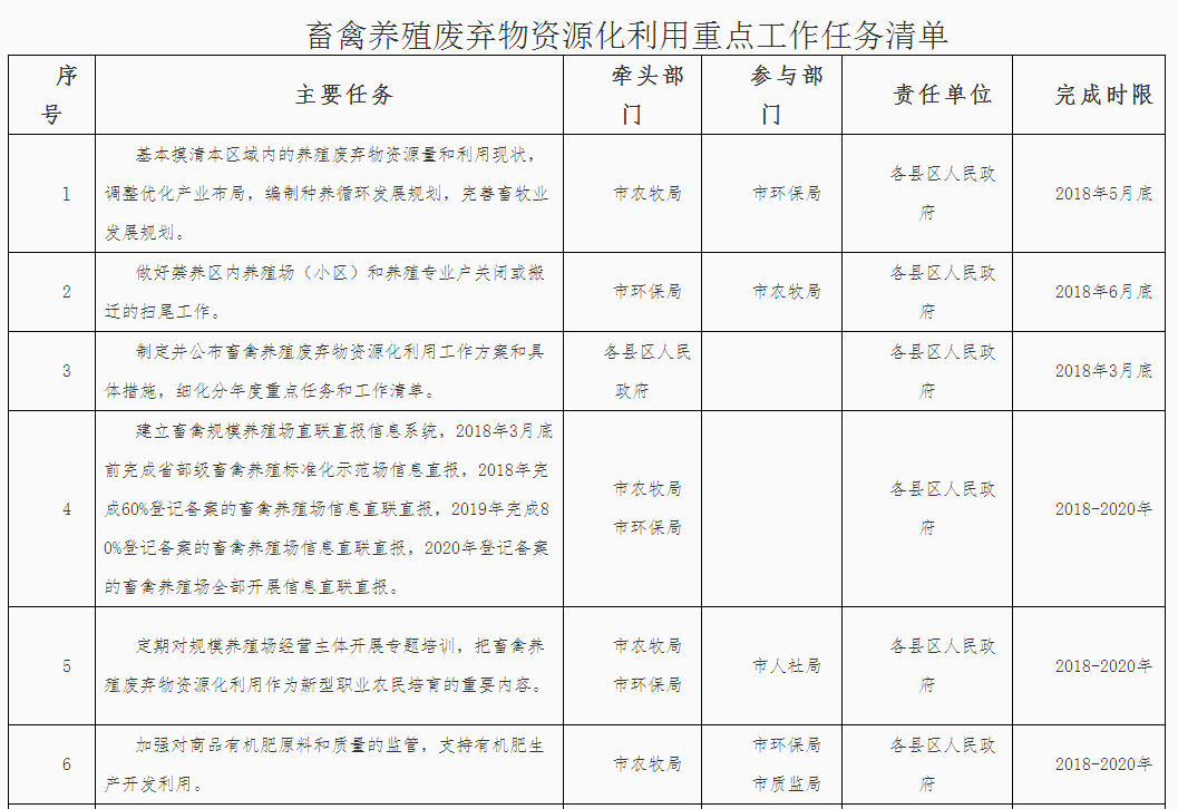 (三)落實屬地管理責(zé)任。落實“菜籃子”市長負(fù)責(zé)制,堅持保供給與保環(huán)境并重,統(tǒng)籌畜產(chǎn)品供給和畜禽糞污治理。各縣區(qū)政府對本行政區(qū)域內(nèi)的畜禽養(yǎng)殖廢棄物資源化利用工作負(fù)總責(zé),要結(jié)合本地實際,依法明確部門職責(zé),構(gòu)建責(zé)任體系,健全工作機制,加大資金投入,完善政策措施,強化日常監(jiān)管,確保各項任務(wù)落實到位。各縣區(qū)人民政府應(yīng)于2018年3月底前制定并公布畜禽養(yǎng)殖廢棄物資源化利用工作方案,細(xì)化分年度的重點任務(wù)和工作清單,并抄送市農(nóng)牧局備案。