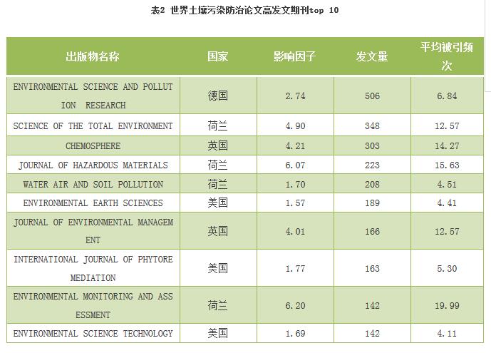 根據(jù)檢索結(jié)果,全球共有736種期刊發(fā)表了土壤污染防治領(lǐng)域的相關(guān)論文,該領(lǐng)域內(nèi)發(fā)文量居前10位的期刊如下(表2)。這10種期刊的總發(fā)文量為1157篇,占總量比例為26.25%,平均影響因子3.485。其中,荷蘭占據(jù)4席,美國占據(jù)3席,英國占據(jù)2席,德國占據(jù)1席。并且,影響因子前三名也均屬荷蘭。發(fā)文最多的期刊是德國的《ENVIRONMENTALSCIENCEANDPOLLUTIONRESEARCH》,影響因子最高的期刊是荷蘭的《ENVIRONMENTALMONITORINGANDASSESSMENT》。由此可見,在土壤污染防治相關(guān)領(lǐng)域中,荷蘭期刊已達(dá)較高的學(xué)術(shù)水平。