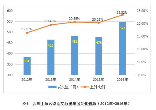 據(jù)統(tǒng)計(jì),中國知網(wǎng)收錄的近5年土壤污染防治核心期刊文獻(xiàn)共2345篇,年度發(fā)文量總體呈上升趨勢(見圖6),上升率由2012年的16.38%升至2016年的23.32%,高出了6.94%,從年度論文數(shù)量的變化中可以看出我國學(xué)術(shù)界對土壤污染防治的關(guān)注度上升,說明我國科研人員越來越重視土壤污染防治的研究。
