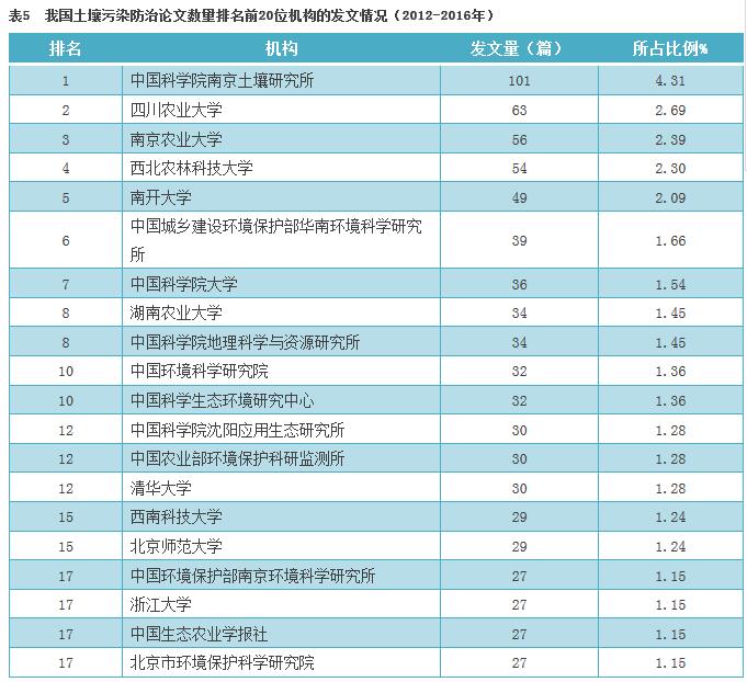 截至2016年發(fā)表的土壤污染防治相關(guān)研究論文中,發(fā)文量位居前20位的科研機(jī)構(gòu)或單位見表5。中國科學(xué)院南京土壤研究所發(fā)文量101篇,以絕對性優(yōu)勢居榜首,四川農(nóng)業(yè)大學(xué)以63篇發(fā)文居第二,南京農(nóng)業(yè)大學(xué)以7篇之差位列第三。前20位的機(jī)構(gòu)中,共有10所高校入圍,其中4所是農(nóng)業(yè)類院校;科研機(jī)構(gòu)有9個(gè)入圍??梢?,高校和科研機(jī)構(gòu)是我國研究土壤污染防治的主力軍。