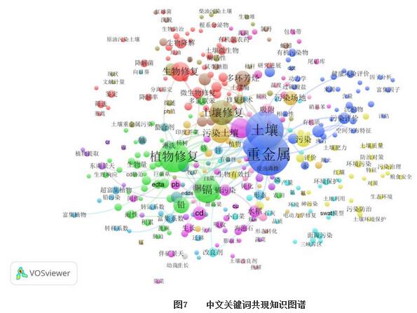 將中國知網(wǎng)收錄的近5年土壤污染防治核心期刊文獻(xiàn)2345篇導(dǎo)入VOSiewer,分析后得出的高頻關(guān)鍵詞見下表。由表6可見,出現(xiàn)頻次最高的是重金屬,出現(xiàn)了454次,遠(yuǎn)遠(yuǎn)高于其他關(guān)鍵詞,出現(xiàn)頻次排名第二和第三分別是土壤和植物修復(fù)。由此可見,我國在土壤污染防治研究領(lǐng)域,關(guān)注最多的是重金屬污染的植物修復(fù)與生物修復(fù)技術(shù)研究,與之前分析的國際研究熱點(diǎn)吻合。