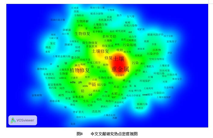 中文關(guān)鍵詞共現(xiàn)知識圖譜和熱點(diǎn)圖分別見圖7和圖8,可以發(fā)現(xiàn)該領(lǐng)域研究熱點(diǎn)集中在土壤重金屬防治技術(shù)研究,包括鎘、鉻、鋅、鉛、砷和汞及持久性有機(jī)污染物,特別是多環(huán)芳烴等的防治技術(shù)研究。在包含植物修復(fù)與微生物修復(fù)的生物修復(fù)技術(shù)研究方面熱度較高。