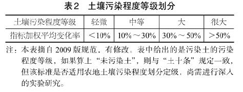 (4)土壤污染程度等級劃分。土壤污染程度是指侵入土壤的致污物質對土壤成分及土體結構和性質的綜合影響程度,不僅指土壤成分和結構的變化程度,還包括土體強度、變形、滲透、腐蝕、吸附、酸堿度、氧化還原、生物養(yǎng)分、毒性等的變化程度,具體視土壤污染程度評價的目的而定,對于農地土壤,宜側重于土壤化學成分評價;對建設用地,宜側重于土體強度、變形等力學性質評價。確定土壤污染程度時,應首先分別計算出每種致污物質所引起的土壤成分、結構和各種性質指標變化的變化率(污染前后指標的差值與污染前指標值之百分比)。然后,分別計算各指標變化率的平均值。然后,再計算各指標平均變化率的加權平均值。最后,依據加權平均變化率按表2確定土壤污染程度等級。