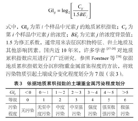 5)致污物質對土壤物質成分的影響程度評價。除了規(guī)范HJ/T166規(guī)定的內梅羅指數法,還可選用地質累積指數法。地質累積指數(geoaccumulationindex,GI)是法國科學家Muller[14]于1969年提出的用于定量評價沉積物(或其他物質)中重金屬富集程度的指標[15,16],其表達式如下: