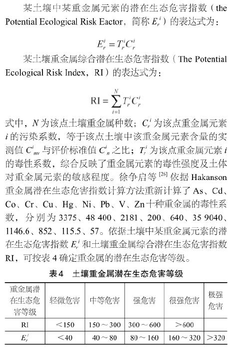 6)致污染物質的潛在生態(tài)危害評價。潛在生態(tài)危害指數法是瑞典地球化學家Hakanson于1980[21]創(chuàng)建的,是以沉積學原理評價環(huán)境重金屬污染及其生態(tài)危害的方法。由于該方法同時考慮了重金屬的種類、濃度、毒性水平及土體對重金屬的敏感性等因素,較為科學合理,因此,被廣泛應用于土壤環(huán)境質量評價,國內有不少學者[22-26]在評價土壤環(huán)境質量時應用了這種方法,并進行了較深入的研究。