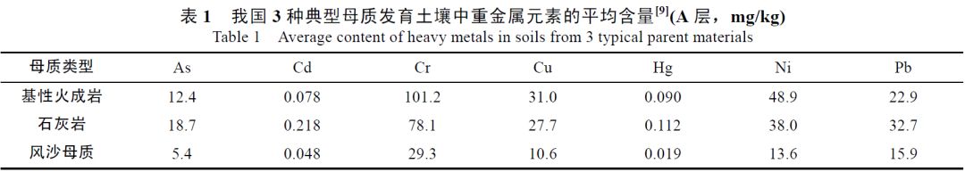 20世紀80年代進行的中國土壤元素背景值調(diào)查結果表明,不同類型母質(zhì)上發(fā)育的土壤,其重金屬含量的差異很大,如As、Cd、Cr、Cu、Hg、Ni和Pb等元素在基性火成巖和石灰?guī)r母質(zhì)發(fā)育的土壤中的平均含量大大高于風沙母質(zhì)土壤。
