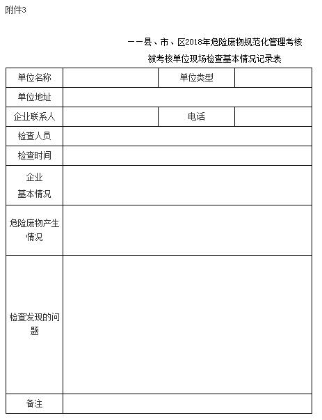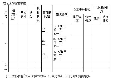 (一)縣、市、區(qū)自查考核。各縣、市、區(qū)環(huán)保局由固體廢物管理、環(huán)境監(jiān)察、環(huán)境監(jiān)測等相關(guān)業(yè)務(wù)部門組成考核組,對產(chǎn)廢單位和經(jīng)營單位進行自查考核。自查考核應(yīng)嚴格執(zhí)行環(huán)境保護部《危險廢物規(guī)范化管理指標體系》(環(huán)辦〔2015〕99號)規(guī)定的考核內(nèi)容和評分標準,不得隨意放寬標準。考核時填寫《被考核單位現(xiàn)場檢查基本情況記錄表》(見附件3)??h級環(huán)保部門自查考核和復(fù)查工作于5月31日前完成,考核結(jié)果及工作報告(工作報告按附件4格式,附考核結(jié)果匯總表)于6月10日前報市局