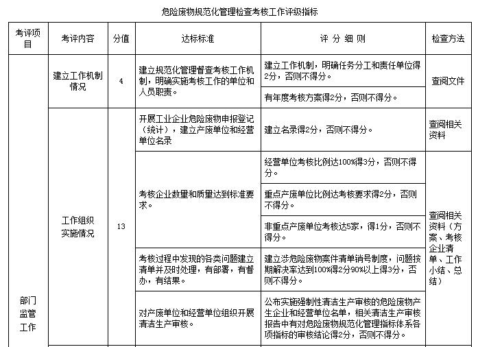 (三)省廳督查考核。省廳將在3月至12月隨時、不定期組織對各市的危險廢物規(guī)范化管理工作進行督查考核評級,并將督查結(jié)果報送環(huán)保部,同時進行全省排名、網(wǎng)上公示。
