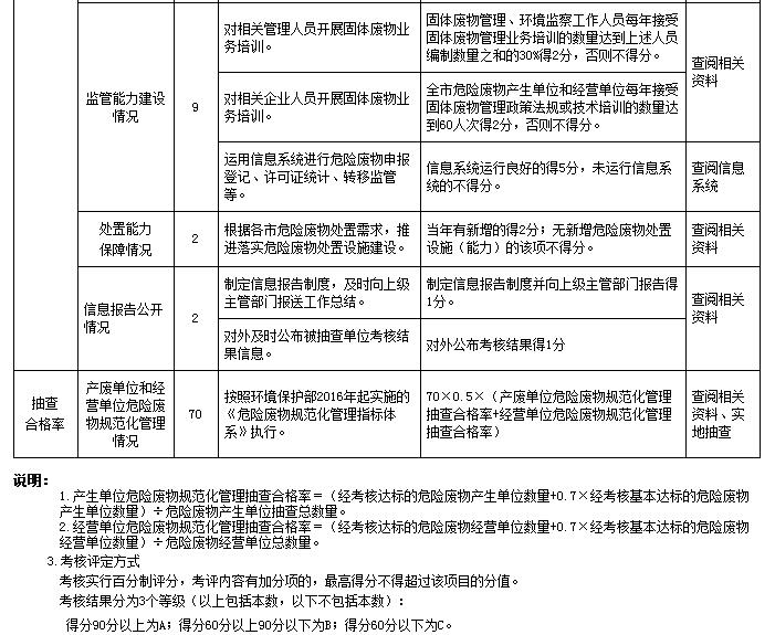 對各縣、市、區(qū)環(huán)保局危險廢物規(guī)范化管理抽查考核工作,按照《危險廢物規(guī)范化管理檢查考核工作評級指標》(見附件5)執(zhí)行,考核比例不低于30%。