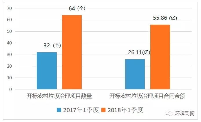 強(qiáng)制垃圾分類試點(diǎn)、農(nóng)村垃圾治理、農(nóng)村人居環(huán)境整治三年行動(dòng)等相關(guān)政策的陸續(xù)出臺(tái)和持續(xù)推進(jìn),農(nóng)村垃圾治理、垃圾分類等非傳統(tǒng)環(huán)衛(wèi)項(xiàng)目不斷涌現(xiàn)。2018年1季度與去年同期相比,垃圾分類和農(nóng)村垃圾治理的項(xiàng)目數(shù)量和中標(biāo)金額均出現(xiàn)倍增。
