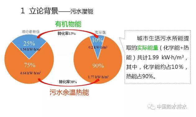 今天我的發(fā)言既與碳中和有關(guān)也跟磷回收有關(guān)。那么,關(guān)于碳中和談得是污水處理的耗能過(guò)程,有機(jī)物及氮磷去除要消耗能量,碳中和即需要從污水處理廠或污水里找到能量去彌補(bǔ)能耗。對(duì)此,大家更多會(huì)想到剩余污泥里有大量含能有機(jī)物,這也是我們搞污水處理人所關(guān)注的,所以,污泥厭氧消化從傳統(tǒng)到現(xiàn)在,以至于有更多的人前赴后繼對(duì)厭氧消化進(jìn)行優(yōu)化提高其能量轉(zhuǎn)化效率,包括前處理,比如說(shuō),高碑店現(xiàn)在的熱水解,就是希望最大化把污泥中的有機(jī)能源轉(zhuǎn)化出來(lái)。但是,我們搞污水處理的人忽視了一個(gè)問(wèn)題,就是說(shuō)除了有機(jī)物形成的化學(xué)能以外,還有大量污水中的余溫?zé)崮堋U?qǐng)大家看這個(gè)圖,有機(jī)物中的化學(xué)能與污水中余溫?zé)崮芟啾?,很少、很少。理論上一個(gè)75%,一個(gè)25%。也就是說(shuō)污泥中有機(jī)物的化學(xué)能只占整個(gè)污水中潛能的25%,75%是熱能。我們給大家先看這樣一個(gè)概念,也就是說(shuō)我們所關(guān)注的厭氧消化轉(zhuǎn)化的能源占整個(gè)污水中的潛能,理論值是25%。那么這25%的有機(jī)能源又能轉(zhuǎn)化多少呢?顯然這是個(gè)理論值,不可能100%轉(zhuǎn)化。