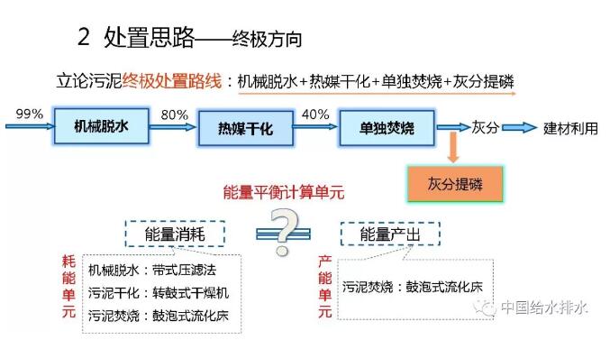 因此,最后只有去“燒”!但是,“燒”必須要經(jīng)過(guò)機(jī)械脫水,含水率99%的污泥首先降至80%;然后,再熱干化到40%以下。到40%就可以自持燃燒了。燒,但污泥焚燒千萬(wàn)不能放在水泥窯中同水泥一塊燒。這樣不對(duì)。會(huì)把磷就全部固定在水泥里,磷再也不能回用了!所以,要單獨(dú)燒。最多可以跟有機(jī)垃圾一塊燒。燒完以后,大量的磷都在灰分里面,需要提取。當(dāng)然了,大家知道,脫水、熱干化、單獨(dú)焚燒都是要輸入能量的,當(dāng)焚燒之后也會(huì)產(chǎn)生能量?,F(xiàn)在我們有一個(gè)問(wèn)題,就是輸入能量和產(chǎn)生的能量能否達(dá)到平衡?我們需要計(jì)算一下,如果能打個(gè)平手那就是很了不起的事了。