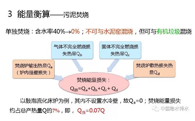 接下來(lái)我們看一下計(jì)算結(jié)果。大家知道,機(jī)械脫水有各種各樣的方法,99%~80%,這里列了很多技術(shù)與設(shè)備,我也不一一匯報(bào)了。常見(jiàn)的是帶式壓濾機(jī),能達(dá)到80%含水率的要求,所以,我們就以帶式壓濾機(jī)為例進(jìn)行計(jì)算,大概耗能折合成干固體每噸是60千瓦小時(shí),即,60度電。熱干化,也就是從80%~40%,我知道搞干化設(shè)備的人有很多,到40%以后基本上就可以自持燃燒了。干化的時(shí)候輸入熱能進(jìn)行蒸發(fā),所需熱量一個(gè)是用于污泥中水分升溫繼而蒸發(fā)的熱量,還有就是污泥升溫的熱量。