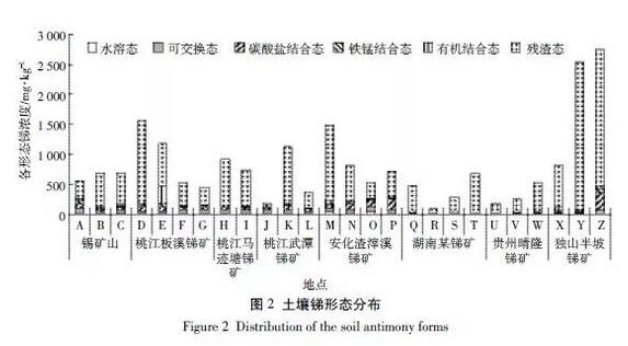 銻的金屬性不強(qiáng),易形成銻的衍生物(銻化物、氫化物、有機(jī)銻化物等),其毒性的大小不僅與其總量有關(guān),很大程度上還取決于其存在形態(tài)。其中單質(zhì)銻的毒性高于其鹽類,無機(jī)銻的毒性高于有機(jī)銻,+3 價(jià)的毒性高于+5 價(jià)(+3 價(jià)的毒性大約是+5 價(jià)的10 倍),且同等價(jià)態(tài)銻的毒性還與其化合物的形態(tài)以及晶體結(jié)構(gòu)有關(guān)。銻在土壤中主要以殘?jiān)鼞B(tài)的形式存在,占總銻的比例最高可達(dá)90%,水溶態(tài)含量最低(圖 2)。