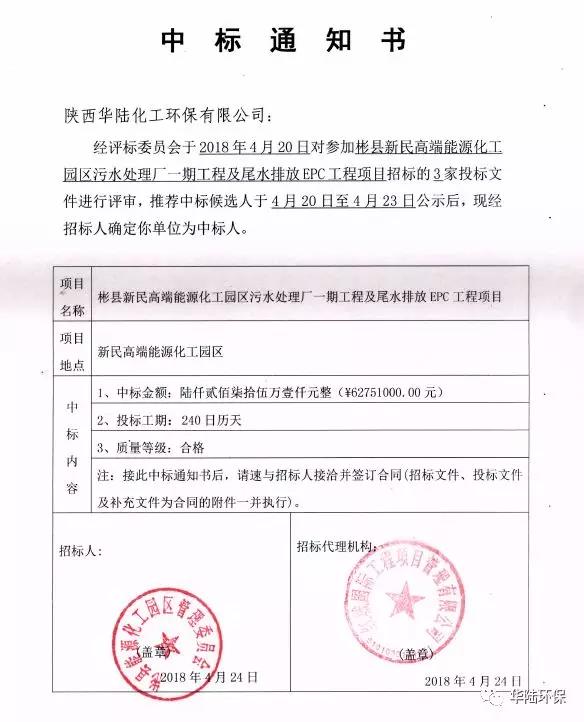 2018年4月24日,陜西華陸化工環(huán)保有限公司成功中標(biāo)彬縣新民高端能源化工園區(qū)污水處理廠一期工程及尾水排放EPC工程項目(以下簡稱:中標(biāo)項目),中標(biāo)金額為6275.1萬元。