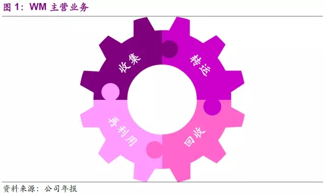美國廢物管理公司 (Waste Management, Inc.,以下簡稱WM)成立于1968年,經(jīng)過多年的成長和發(fā)展,從數(shù)個(gè)小型垃圾收集站逐步發(fā)展為全球固廢的絕對龍頭。公司在目前在美國和加拿大地區(qū)為市政、商業(yè)、工業(yè)及居民客戶提供廢品管理服務(wù),包括收集、轉(zhuǎn)運(yùn)、再利用、資源回收服務(wù)。