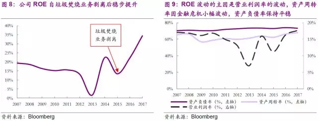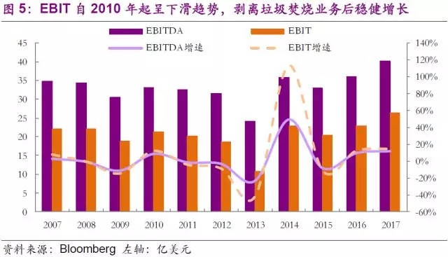 由于金融危機(jī)和垃圾焚燒電價(jià)下降等多重因素共同作用,公司ROE自2007年起逐步走低。隨著多個(gè)長期垃圾焚燒發(fā)電合同的到期,公司需要重新按照市場價(jià)格續(xù)簽合同,經(jīng)過慎重評估后,公司在2013年確認(rèn)了高達(dá)4.83億美元的Wheelabrator公司商譽(yù)減值,在營業(yè)收入略有增長的情況下,將公司EBIT從2012年的18.5億美元直線拉低至10.8億美元,帶動(dòng)公司營業(yè)利潤率跌破10%,ROE也降到不足2%。雖然2014年Wheelabrator營業(yè)收入有所增長,但是站在公司長期戰(zhàn)略性角度考慮,垃圾焚燒業(yè)務(wù)已不再屬于公司核心業(yè)務(wù)。公司最終于2014年正式出售Wheelabrator子公司及其全部垃圾焚燒業(yè)務(wù)。經(jīng)過2015年的剝離陣痛后,公司營業(yè)利潤率和ROE重新回到歷史高位。