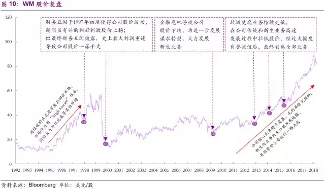 公司的發(fā)展之路并非一帆風(fēng)順。通過1970—1990年間的大肆并購擴(kuò)張,從傳統(tǒng)的收集轉(zhuǎn)運(yùn)領(lǐng)域拓展到回收、危廢等市場,公司成功成為全球第一的固廢公司。但因擴(kuò)張過快、戰(zhàn)略不當(dāng)?shù)纫蛩兀驹?999年被市值和營業(yè)收入遠(yuǎn)小于自己的USA Waste Services Inc并購,財(cái)務(wù)丑聞事件最終被披露也使得公司股價(jià)一落千丈。合并后的公司并沒有從此一蹶不振,而是通過不斷優(yōu)化公司經(jīng)營策略,聚焦核心主業(yè)的同時(shí)大力發(fā)展新生化業(yè)務(wù),引領(lǐng)公司一路走高至目前的近400億美元市值。