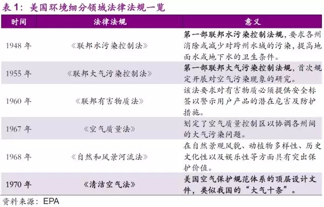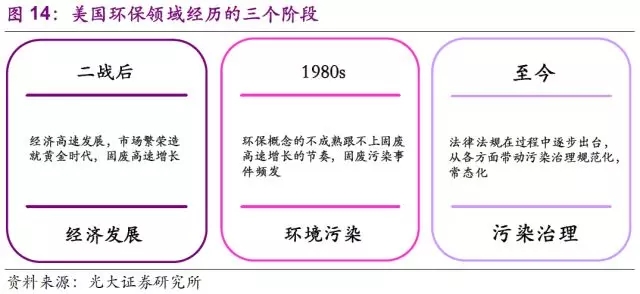 和其他發(fā)達(dá)國家一樣,美國在環(huán)保領(lǐng)域同樣經(jīng)歷了“經(jīng)濟(jì)發(fā)展—環(huán)境污染—污染治理”這一過程,而這三者之間的脈絡(luò)基本對應(yīng)固廢行業(yè)的第三,四階段。在這兩個(gè)階段之前美國出臺的一系列法規(guī),先后幫助固廢行業(yè)的完善成長以及促使其朝著平穩(wěn)可持續(xù)健康的發(fā)展業(yè)態(tài)前進(jìn)。