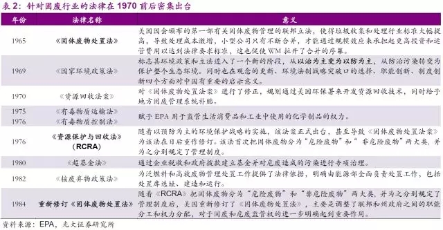 雖然以上法律法規(guī)的頒布和公司所處的固廢行業(yè)并無太大的關(guān)聯(lián),但這段時(shí)期環(huán)保領(lǐng)域法律法規(guī)的密集出臺,拉開了美國政府正式通過行政干預(yù)環(huán)境治理以及扶持環(huán)保產(chǎn)業(yè)崛起的序幕,對固廢行業(yè)的發(fā)展打下了堅(jiān)實(shí)的基礎(chǔ)。