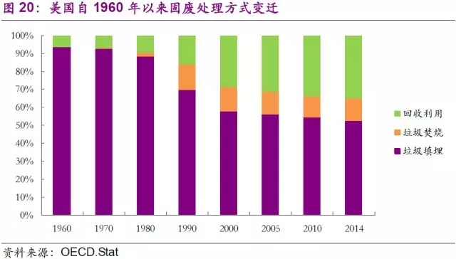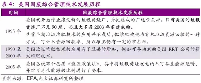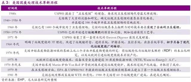 固廢行業(yè)的技術(shù)發(fā)展同樣是制約市場和公司發(fā)展的另一個(gè)決定性因素。早在1940年,美國公共衛(wèi)生署(USPHS)便開始推行了一系列固廢處置的技術(shù)性試驗(yàn),從“衛(wèi)生填埋代替露天堆放”,到“垃圾堆肥的探索和試驗(yàn)”,再到“垃圾焚燒”,最后到了如今大力推廣的“廢物能源回收”的綜合利用。