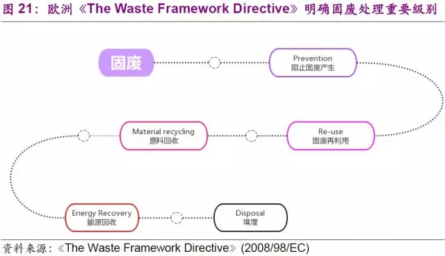 如果分析中國、美國、日本/西歐在固廢行業(yè)的發(fā)展,基本是逐漸完善固廢最大化利用產(chǎn)業(yè)鏈的過程。中國的垃圾填埋和垃圾焚燒技術(shù)已經(jīng)相對成熟,國家在《“十三五”全國城鎮(zhèn)生活垃圾無害化處理設(shè)施建設(shè)規(guī)劃》中也規(guī)定了2020年城市垃圾無害化處理達(dá)到100%的指標(biāo)要求。但是在處置前端的垃圾分類,以及后端的回收利用,中國距發(fā)達(dá)國家仍有較大的差距。美國擁有完善的固廢收運(yùn)和處理系統(tǒng),但是由于前端垃圾分類的不徹底,導(dǎo)致后端回收利用率受限。日本/西歐則是目前行業(yè)發(fā)展金字塔的頂端。兩個(gè)地區(qū)擁有完善的前端垃圾分類和收運(yùn)轉(zhuǎn)運(yùn)體系,垃圾焚燒和循環(huán)再造業(yè)務(wù)則是兩個(gè)地區(qū)后端處置的不同特色。