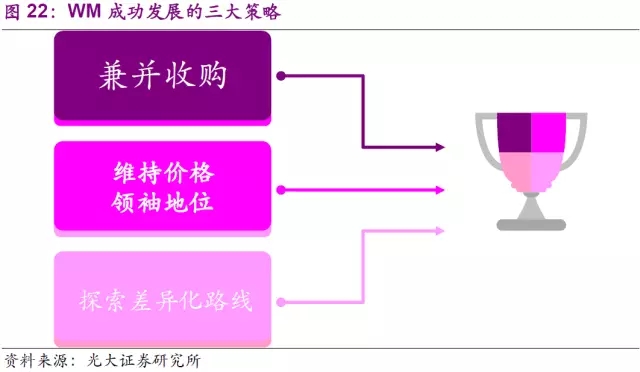 縱觀WM發(fā)展的歷史,它既享受到外部經(jīng)濟(jì)和行業(yè)高速發(fā)展所帶來的廣闊市場,也需經(jīng)歷經(jīng)濟(jì)危機(jī)和市場轉(zhuǎn)型所帶來的陣痛。公司為搶占市場份額,穩(wěn)固龍頭地位,實(shí)現(xiàn)股東最大化方面做出了多方面努力,制定了各類執(zhí)行策略以期達(dá)到目標(biāo),而我們認(rèn)為其中最重要的是三項(xiàng)策略,也是我們將進(jìn)一步細(xì)致分析的,即兼并收購,維持價(jià)格領(lǐng)袖地位,以及探索差異化路線。