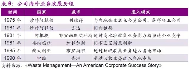 在美國成功擴(kuò)張的同時(shí),WMI也抓住了在國際市場上發(fā)展的機(jī)遇。1975年,公司通過與當(dāng)?shù)仄髽I(yè)成立合資公司的方式,成功的打開了沙特首都利雅得的環(huán)衛(wèi)市場,這也是世界上第一個(gè)跨國的環(huán)衛(wèi)合同。這個(gè)合同的示范效應(yīng)給了WMI世界范圍的關(guān)注。1980年,公司先后成功進(jìn)入了阿根廷、委內(nèi)瑞拉、澳大利亞、部分歐洲國家,以及香港的危廢及環(huán)衛(wèi)市場,并于1990年成為了世界最大的固廢龍頭。