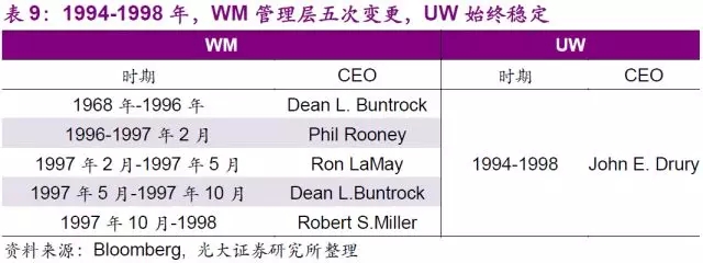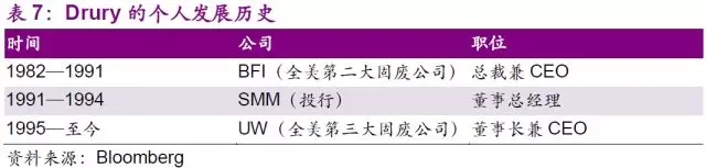 值得一提的是UW高速發(fā)展的源動(dòng)力,公司CEO John E.Drury。作為Browning-Ferris Industries(以下簡稱“BFI”)的總裁兼COO,Drury用了10年時(shí)間引領(lǐng)BFI成為全美第二大固廢公司的位置,然而因?yàn)椴唤邮芄綜EO大力發(fā)展垃圾回收行業(yè)的決定,離開公司并于1994年擔(dān)任UW的CEO。Drury僅花了3年時(shí)間,通過1995年的5次大型收購,以及1996年的30次小型收購,將公司的營業(yè)收入從1994年的434萬美元大幅增長至1997年的26億美元,增速高達(dá)598倍。