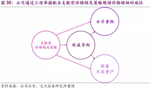 價(jià)格領(lǐng)袖是指經(jīng)由同業(yè)的龍頭公司現(xiàn)行制定產(chǎn)品某一期間內(nèi)的價(jià)格后,其它公司根據(jù)制定的價(jià)格,就其同質(zhì)產(chǎn)品確定其價(jià)格。行業(yè)的競爭對手如果期望維持已有的市場份額,只能與領(lǐng)先公司制定的價(jià)格相匹配。WM在通過兼并收購占據(jù)統(tǒng)治性的市場份額后,利用龍頭地位果斷選擇了支配型價(jià)格領(lǐng)先策略,進(jìn)一步通過“收益導(dǎo)向策略”、“合并重組”、“剝離不良資產(chǎn)”這三項(xiàng)舉措的實(shí)施維持其價(jià)格領(lǐng)袖的地位。