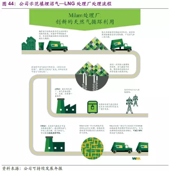 在此基礎(chǔ)上,公司也在領(lǐng)先研究填埋沼氣—天然氣的市場化進(jìn)程。公司先是于2005年在加州建立了全球最大的填埋沼氣—LNG處理廠,隨后分別于2014和2016年在俄亥俄州和伊利諾伊州建立了兩座填埋沼氣—壓縮天然氣處理廠。上述天然氣的產(chǎn)出在兩方面得到利用:一是用于公司自有的垃圾收集車(40%),二是進(jìn)入天然氣管網(wǎng)銷售,在降低公司運(yùn)營成本的同時(shí)也提供了一定營收。