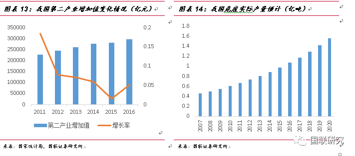 ②第二產(chǎn)業(yè)增加值測(cè)算法:由于危廢排放的企業(yè)多數(shù)來(lái)自于化工、有色等中游制造企業(yè),我們認(rèn)為危廢的實(shí)際產(chǎn)生量將與第二產(chǎn)業(yè)的景氣度是呈現(xiàn)正相關(guān)性。2007年至2016年,我國(guó)第二產(chǎn)業(yè)的增加值由11.58萬(wàn)億元增長(zhǎng)到29.65萬(wàn)億元,復(fù)合增長(zhǎng)率達(dá)9.91%,2007年污染源第一次普查時(shí)危廢實(shí)際產(chǎn)量為4573萬(wàn)噸,在默認(rèn)普查數(shù)據(jù)為準(zhǔn)確數(shù)據(jù)的情況下,按照9.91%的危廢增長(zhǎng)速率進(jìn)行測(cè)算,2016年我國(guó)危廢實(shí)際產(chǎn)生量將達(dá)到1.07億噸。