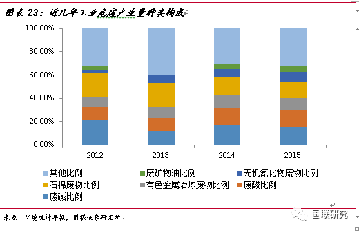 根據(jù)2015年環(huán)境統(tǒng)計(jì)年報(bào)的數(shù)據(jù),工業(yè)危廢產(chǎn)生量種類構(gòu)成中產(chǎn)量最大的依次分別為廢堿 623.0 萬(wàn)噸(占比15.7%)、廢酸 571.2 萬(wàn)噸(占比14.4%)、石棉廢物 549.2 萬(wàn)噸(占比13.8%)、有色金屬冶煉廢物 388.9 萬(wàn)噸(占比9.8%)、無(wú)機(jī)氰化物廢物 355.5 萬(wàn)噸(占比8.9%)以及廢礦物油 213.0 萬(wàn)噸(占比5.4%),適合于采用資源化利用的廢堿、廢酸、有色金屬冶煉廢物等占工業(yè)危廢約為40%。從產(chǎn)業(yè)調(diào)研情況來(lái)看,危廢資源化空間將進(jìn)一步縮小,而無(wú)害化則處于供不應(yīng)求狀態(tài),近些年隨著監(jiān)管的趨嚴(yán),無(wú)害化處理的占比將提高,未來(lái)空間將被放大。