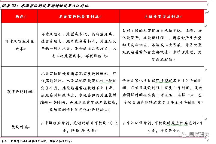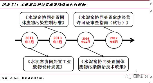 水泥窯協(xié)同處置—危廢無(wú)害化處置的有益補(bǔ)充。政策刺激下,水泥窯協(xié)同處置危廢應(yīng)運(yùn)而生。2011年3月,《水泥窯協(xié)同處置工業(yè)廢物設(shè)計(jì)規(guī)范》正式出臺(tái),文件對(duì)工業(yè)廢物處置規(guī)模、技術(shù)等進(jìn)行了詳細(xì)要求,標(biāo)志著對(duì)水泥窯協(xié)同處置政策成熟化的開(kāi)端。2013年兩高司法提出非法排放、傾倒、處理3噸以上的危廢入刑,從法律層面上對(duì)危廢的排放進(jìn)行了強(qiáng)有力的監(jiān)管,同年3月,《水泥窯協(xié)同處置固體廢物污染控制標(biāo)準(zhǔn)》出臺(tái),規(guī)定了污染排放限值、水泥窯設(shè)施技術(shù)要求以及入窯廢物的特性要求,作為水泥窯協(xié)同處置領(lǐng)域規(guī)范性文件推動(dòng)了行業(yè)的持續(xù)發(fā)展。2016年12月,《水泥窯協(xié)同處置固體廢物污染防治技術(shù)政策》出臺(tái),文中明確了協(xié)同處置固廢應(yīng)利用現(xiàn)有新型干法水泥窯,采用窯磨一體化的運(yùn)行方式進(jìn)行運(yùn)作,政策發(fā)布之后,新建、改建或擴(kuò)建處置危險(xiǎn)廢物的水泥企業(yè),應(yīng)按照要求選擇單線設(shè)計(jì)熟料生產(chǎn)規(guī)模 4000噸/日及以上水泥窯。2017年6月,《水泥窯協(xié)同處置危廢經(jīng)營(yíng)許可證審查指南(試行)》出臺(tái),對(duì)水泥窯協(xié)同處置危廢的適用范圍、術(shù)語(yǔ)定義、經(jīng)營(yíng)模式及技術(shù)規(guī)范等方面進(jìn)行了詳細(xì)規(guī)定,并將協(xié)同處置的新型干法水泥窯熟料產(chǎn)能的標(biāo)準(zhǔn)重新進(jìn)行了修訂,由之前4000噸/日調(diào)整下降到2000噸/日,進(jìn)一步擴(kuò)大了產(chǎn)能空間。