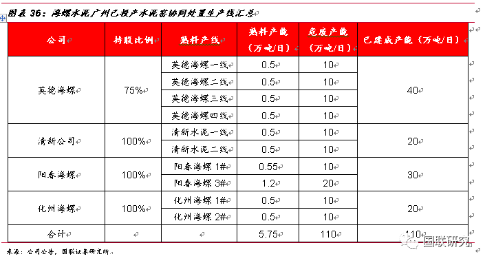 以廣東省為試點(diǎn),公司攜手海螺創(chuàng)業(yè)深耕危廢領(lǐng)域。公司與海螺創(chuàng)業(yè)將以包括但不限于股權(quán)合作的方式進(jìn)行廣東省水泥窯協(xié)同處置固廢布點(diǎn),包括但不限于以《廣東省環(huán)境保護(hù)“十三五”規(guī)劃》和《廣東省水泥行業(yè)轉(zhuǎn)型升級(jí)技術(shù)路線和行動(dòng)計(jì)劃(2016-2018年)》為指導(dǎo)。根據(jù)“十三五”期間規(guī)劃要求,廣東省水泥窯協(xié)同處置危廢產(chǎn)能為500萬(wàn)噸/年,據(jù)海螺水泥公司公告統(tǒng)計(jì),其在廣東省內(nèi)共計(jì)有4家子公司,分別為英德海螺、清新水泥、化州海螺以及陽(yáng)春海螺,共計(jì)10條投產(chǎn)線,已建成熟料產(chǎn)能分別為2萬(wàn)噸/日、1萬(wàn)噸/日、1萬(wàn)噸/日以及1.75萬(wàn)噸/日,若全部完成協(xié)同改造,危廢產(chǎn)能總計(jì)將達(dá)110萬(wàn)噸/年。