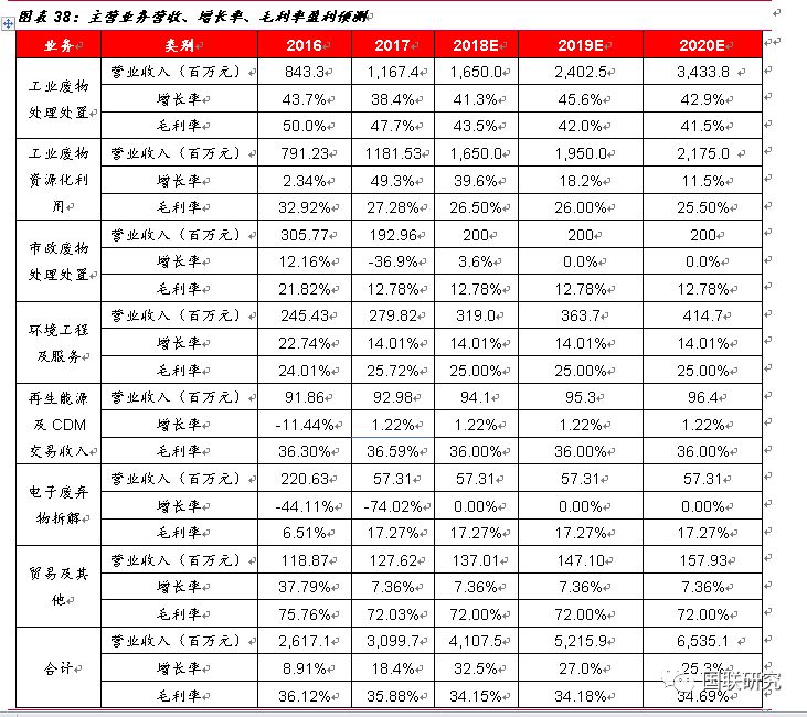 1.河北衡水睿韜項(xiàng)目(無(wú)害化)、江西固廢二期(資源化)、福建南平(無(wú)害化)、山東濰坊東江(無(wú)害化+資源化)、湖北仙桃綠怡(資源化)、江蘇南通(無(wú)害化)、泉州PPP項(xiàng)目(無(wú)害化+資源化)項(xiàng)目于2018年建成并投產(chǎn)使用。2018-2020年無(wú)害化產(chǎn)能分別為110萬(wàn)噸、155萬(wàn)噸、205萬(wàn)噸。2.考慮到后期有部分項(xiàng)目進(jìn)行技術(shù)升級(jí)改造,以及公司正在加大物化業(yè)務(wù)市場(chǎng)拓展和資質(zhì)匹配,2018-2020年產(chǎn)能利用率按照60%、62%、65%進(jìn)行測(cè)算。3.由于目前危廢處置仍然存在較大的供需缺口,暫不考慮價(jià)格因素對(duì)公司收入的影響,無(wú)害化處置價(jià)格2018-2020年全部按照2500元/噸進(jìn)行預(yù)測(cè)。4.由于自2016年10月開(kāi)始大宗商品價(jià)格有所回暖,近期趨于穩(wěn)定,根據(jù)上海金屬網(wǎng)價(jià)格顯示,金屬銅2016-2017年均價(jià)上漲28%,預(yù)計(jì)2017-2020年資源化產(chǎn)品價(jià)格增幅分別為14%、0%、0%、0%,均價(jià)全部按照1500元/噸進(jìn)行計(jì)算,2018-2020年資源化產(chǎn)能按照110萬(wàn)噸、130萬(wàn)噸、145萬(wàn)噸計(jì)算。5.保守起見(jiàn),暫不考慮參股海螺創(chuàng)業(yè)帶來(lái)的收入影響。
