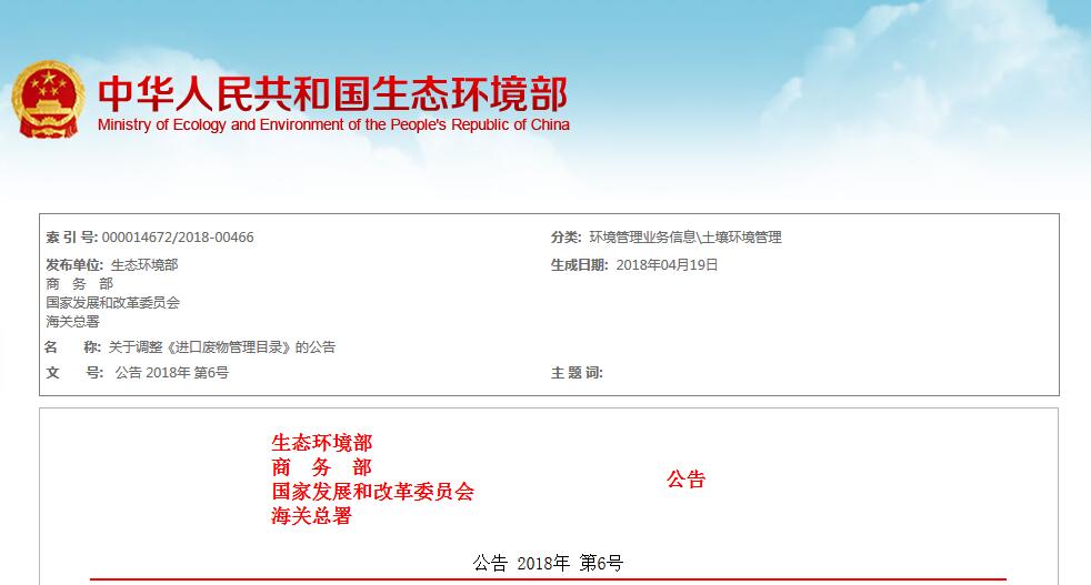 關(guān)于調(diào)整《進口廢物管理目錄》的公告