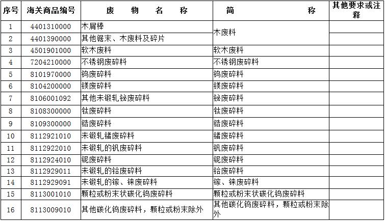 二、將不銹鋼廢碎料、鈦廢碎料、木廢碎料等16個品種固體廢物(見附件2),從《限制進口類可用作原料的固體廢物目錄》《非限制進口類可用作原料的固體廢物目錄》調(diào)入《禁止進口固體廢物目錄》,自2019年12月31日起執(zhí)行。