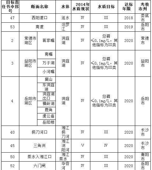 其中:洞庭湖水環(huán)境質(zhì)量大幅改善,到2020年,除總磷≤0.1mg/L外,洞庭湖湖體其他指標(biāo)達(dá)到Ⅲ類水質(zhì)要求。益陽(yáng)皇家湖、后江湖、三仙湖,岳陽(yáng)南湖、芭蕉湖、東風(fēng)湖,常德珊珀湖等內(nèi)湖水質(zhì)達(dá)到水環(huán)境功能區(qū)目標(biāo)要求;湘江漣水西陽(yáng)渡口、汨羅江南渡等斷面水質(zhì)達(dá)到年度考核目標(biāo)要求;地級(jí)城市集中式飲用水水源水質(zhì)達(dá)到或優(yōu)于Ⅲ類比例高于 96.4%;地下水考核點(diǎn)位水質(zhì)保持穩(wěn)定。