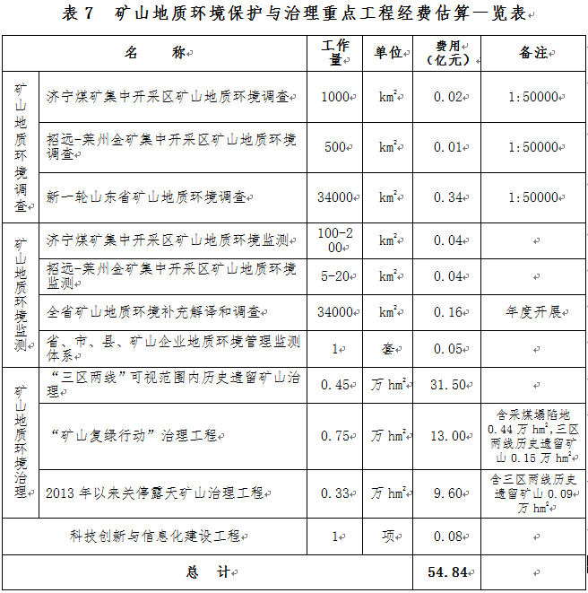 主要包括制定出臺山東省礦山地質環(huán)境恢復與綜合治理技術標準,推廣應用先進技術和完善山東省礦山地質環(huán)境信息化系統(tǒng)三部分,工作經(jīng)費估算為0.08億元。
