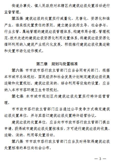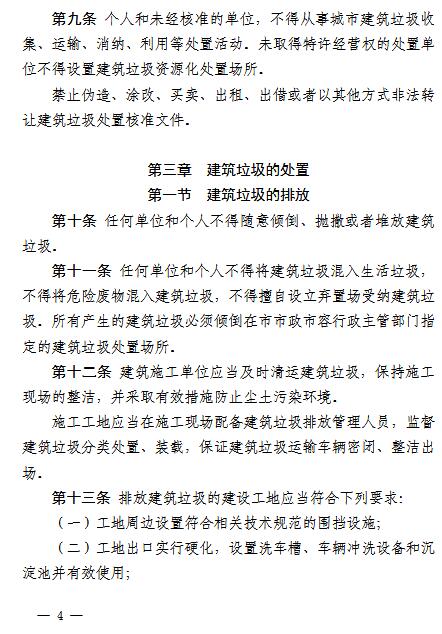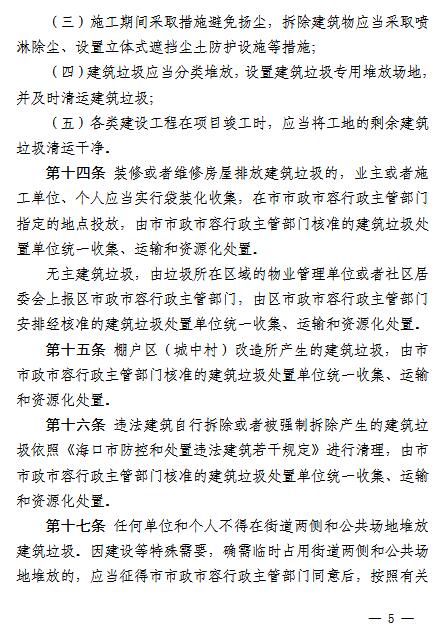 《辦法》要求,在建筑垃圾的排放上,任何單位和個(gè)人不得隨意傾倒、拋撒或者堆放建筑垃圾,不得將建筑垃圾混入生活垃圾,不得將危險(xiǎn)廢物混入建筑垃圾,不得擅自設(shè)立棄置場(chǎng)受納建筑垃圾。因建設(shè)等特殊需要,確需臨時(shí)占用街道兩側(cè)和公共場(chǎng)地堆放的,應(yīng)當(dāng)征得海口市市政市容行政主管部門同意后,按照有關(guān)規(guī)定辦理審批手續(xù)。裝修或者維修房屋排放建筑垃圾的,應(yīng)當(dāng)實(shí)行袋裝化收集;無(wú)主建筑垃圾,由垃圾所在區(qū)域的物業(yè)管理單位或者社區(qū)居委會(huì)上報(bào)各區(qū)市政市容行政主管部門;棚戶區(qū)(城中村)改造所產(chǎn)生的建筑垃圾,由??谑姓腥菪姓鞴懿块T核準(zhǔn)的建筑垃圾處置單位統(tǒng)一收集、運(yùn)輸和資源化處置。