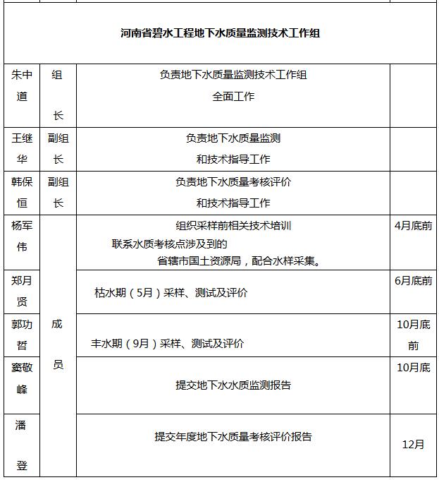 成立河南省碧水工程地下水質(zhì)量監(jiān)測(cè)技術(shù)工作組,由河南省地質(zhì)環(huán)境監(jiān)測(cè)院副院長(zhǎng)朱中道任組長(zhǎng),總工程師王繼華、實(shí)驗(yàn)測(cè)試中心主任韓保恒任副組長(zhǎng),工作組成員:楊軍偉、鄭月賢、郭功哲、竇敬峰、潘登等。部門(mén)負(fù)責(zé)牽頭,具體工作由河南省地質(zhì)環(huán)境監(jiān)測(cè)院承擔(dān),省轄市國(guó)土資源局從事地質(zhì)環(huán)境監(jiān)測(cè)工作的負(fù)責(zé)人參與配合。