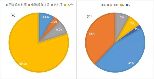 污泥常被認(rèn)為擁有巨大的資源化潛力。然而,無論從產(chǎn)量還是品質(zhì)上,污泥資源化潛力遠(yuǎn)不如生活垃圾、農(nóng)林廢棄物等大宗廢物。據(jù)國家統(tǒng)計(jì)局?jǐn)?shù)據(jù),2016年,我國生活垃圾清運(yùn)量達(dá)2.0億噸,而市政污泥產(chǎn)生量約4000萬噸(以80%含水率的脫水污泥計(jì)),扣除水分后,干固體僅800萬噸。我國污泥有機(jī)質(zhì)含量普遍偏低,一般為30~60%,這意味著前述干固體中還有大量缺乏資源化價(jià)值的無機(jī)質(zhì)。雖然這些無機(jī)質(zhì)可以用于制建材,但這種方式更適宜稱為廢棄物消納而非資源化利用。有機(jī)質(zhì)中,難以生物降解的木質(zhì)纖維素含量約14~30%,腐殖酸含量約10~15%,它們的存在進(jìn)一步降低了污泥生物轉(zhuǎn)化能源的效率。以污泥有機(jī)質(zhì)含量60%為例,脫水污泥成分可以用圖1(a)概括。從污泥干固體元素組成看,其碳含量相遠(yuǎn)低于生物質(zhì)廢物。根據(jù)對幾十座南方污水廠污泥性質(zhì)的調(diào)查,其平均元素組成如圖1(b)所示,其中碳元素作為多種資源化處理技術(shù)的利用對象,其比例僅45%。從污泥有機(jī)物組成看,蛋白質(zhì)是主要成分,但其含量不超過50%,其次是多糖、腐殖酸、脂類等。