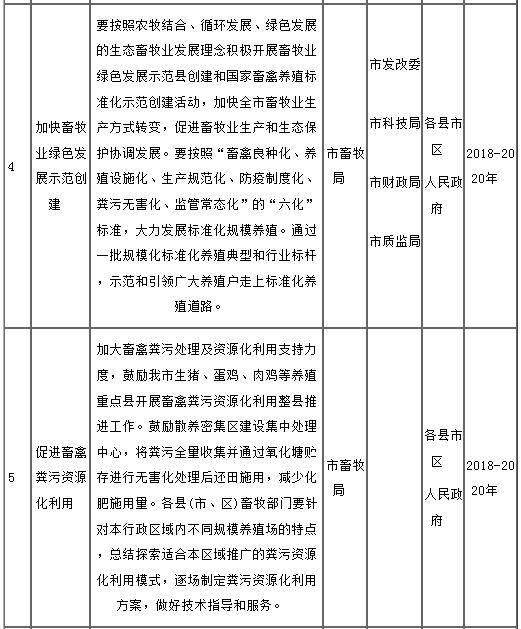 (二)工作目標(biāo)。到2020年,基本解決畜禽糞污處理和資源化利用問(wèn)題,構(gòu)建種養(yǎng)循環(huán)發(fā)展機(jī)制,全市畜禽糞污綜合利用率達(dá)到75%以上,規(guī)模養(yǎng)殖場(chǎng)糞污處理設(shè)施裝備配套率達(dá)到95%以上,大型規(guī)模養(yǎng)殖場(chǎng)糞污處理設(shè)施裝備配套率提前一年達(dá)到100%。申報(bào)省級(jí)畜牧業(yè)綠色發(fā)展示范縣的縣市區(qū)及國(guó)家級(jí)畜禽標(biāo)準(zhǔn)化示范企業(yè)率先實(shí)現(xiàn)上述目標(biāo)。