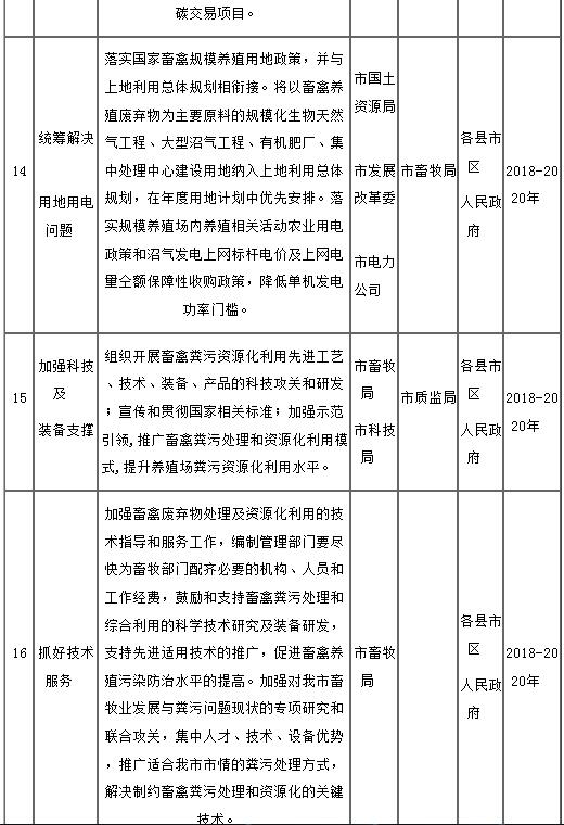 (三)加強(qiáng)畜禽規(guī)模養(yǎng)殖場(chǎng)糞污處理設(shè)施建設(shè)。各縣市區(qū)畜牧獸醫(yī)部門要做好畜禽糞污處理和資源化利用的指導(dǎo)和服務(wù)工作,對(duì)新建、改建、擴(kuò)建的規(guī)模養(yǎng)殖場(chǎng)嚴(yán)格執(zhí)行“三同時(shí)”制度,做好環(huán)評(píng)報(bào)告或備案,加強(qiáng)事中事后監(jiān)管。糞污處理設(shè)施不符合要求的規(guī)模養(yǎng)殖場(chǎng)要加快對(duì)現(xiàn)有畜禽糞污處理基礎(chǔ)設(shè)施和裝備進(jìn)行改造升級(jí)。以養(yǎng)殖場(chǎng)投入為主、政府適當(dāng)補(bǔ)助、引入環(huán)??萍己陀袡C(jī)肥加工企業(yè)共同參與等方式,加大畜禽糞污處理設(shè)施配套建設(shè)力度。縣級(jí)畜牧部門和環(huán)保部門要督促建設(shè)進(jìn)度,聯(lián)合對(duì)規(guī)模養(yǎng)殖場(chǎng)糞污處理設(shè)施配套情況進(jìn)行驗(yàn)收,并及時(shí)上報(bào)驗(yàn)收情況。到2020年要基本完成規(guī)模養(yǎng)殖場(chǎng)糞污處理設(shè)施建設(shè)任務(wù)。(市畜牧局牽頭,市市環(huán)保局、市發(fā)展改革委、市財(cái)政局參與)