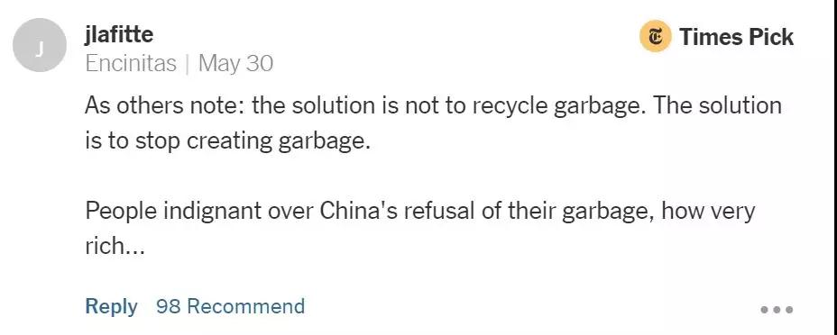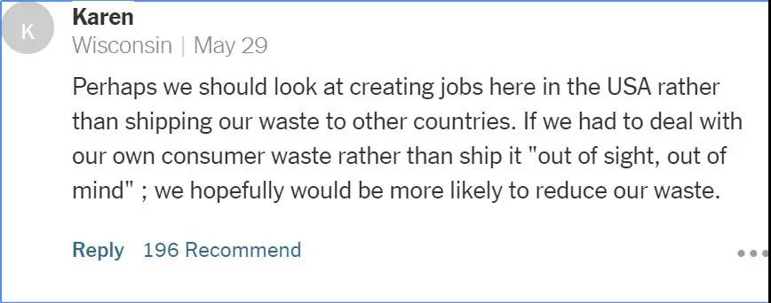 “我們應(yīng)該致力于在美國國內(nèi)創(chuàng)造更多的垃圾處理相關(guān)的就業(yè)崗位,而不是把垃圾轉(zhuǎn)運(yùn)到其他國家。如果我們能意識(shí)到自行處理垃圾是件多么困難的事情的話,我們的浪費(fèi)也就自然而然減少了?!?/p>