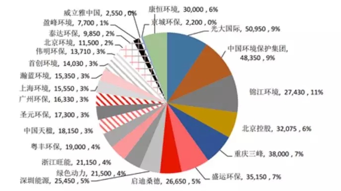中國垃圾焚燒市場占率(按2016年底在手項(xiàng)目規(guī)模統(tǒng)計(jì))