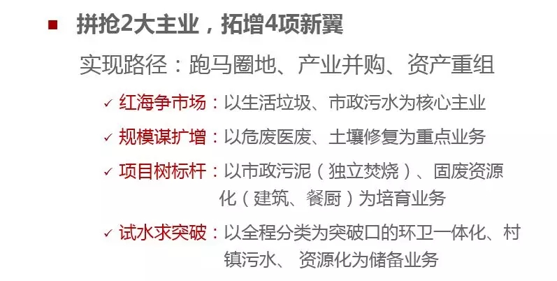 抓住環(huán)保行業(yè)持續(xù)增長的趨勢和新興業(yè)務(wù)爆發(fā)式增長的契機(jī),繼續(xù)以“2+4”業(yè)務(wù)為重點(diǎn),通過實(shí)施主動擴(kuò)張戰(zhàn)略,快速提升市場規(guī)模,確保三年發(fā)展成為“3+3”并力爭向“4+2”業(yè)務(wù)格局轉(zhuǎn)型,并探索業(yè)務(wù)的延伸。